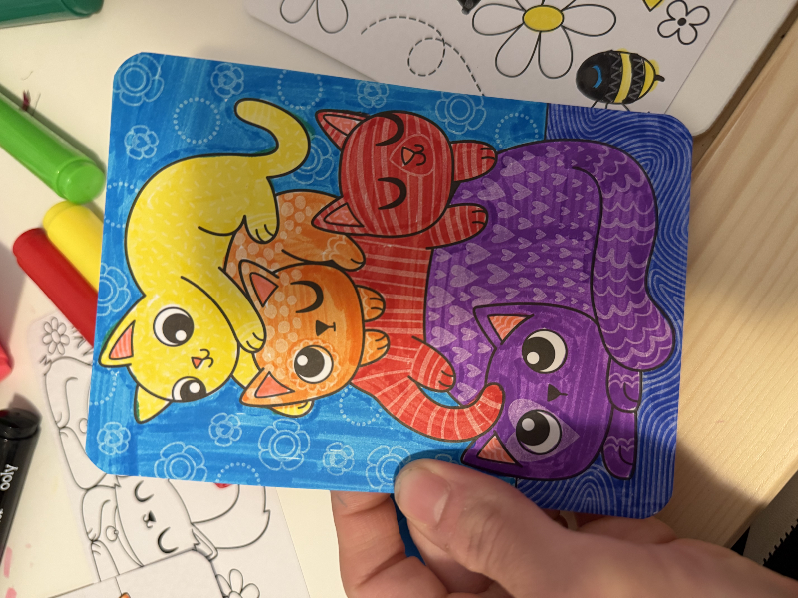 Cartonașe simpatice cu pisicuțe hazlii. Fiecare parte din desen are modele diferite care pot fi descoperite colorând cartonașele.