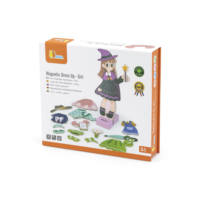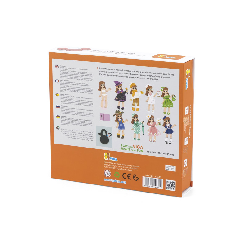 Acest set include o papusa din lemn, magnetica reprezentand o fetita, cu un suport din lemn si peste 40 de piese vestimentare magnetice colorate si atractive pentru a crea 8 uniforme sau tinute profesionale!  Papusa imbracata ii ajuta pe copii sa dezvolte mai multe abilitati, cum ar fi coordonarea mana-ochi, recunoasterea culorilor, motricitatea fina, abilitatile de numarare si sortare si incurajeaza gandirea creativa si jocul imaginativ.Papusa, suportul si piesele pot fi depozitate in cutie. Jucarie educativa din lemn, Montessori.    Dimensiuni: 20.5 x 19 x 4,5 cm    Varsta recomandata: 3 ani+   *AVERTISMENT! Contraindicat copiilor mai mici de 3 ani. Jucaria/produsul poate contine piese mici care se pot inghiti sau inhala existand pericolul de sufocare sau nu este potrivita copiilor mai mici de luni. Toate jucariile marca VIGA sunt fabricate din lemn de calitate cu vopsele si cerneluri non-toxice, supuse testelor de siguranta respectand standardele pentru jucarii ale Uniunii Europene EN71 si ASTM. Nu lasati ambalajul produsului la indemana copiilor. Indepartati orice ambalaj al produsului inainte de a da jucaria copilului. Va recomandam sa supravegheati copilul in timp ce se foloseste produsul. Pastrati instructiunile si etichetele pentru referinte viitoare. Feriti produsul de foc, temperaturi ridicate si umiditate.