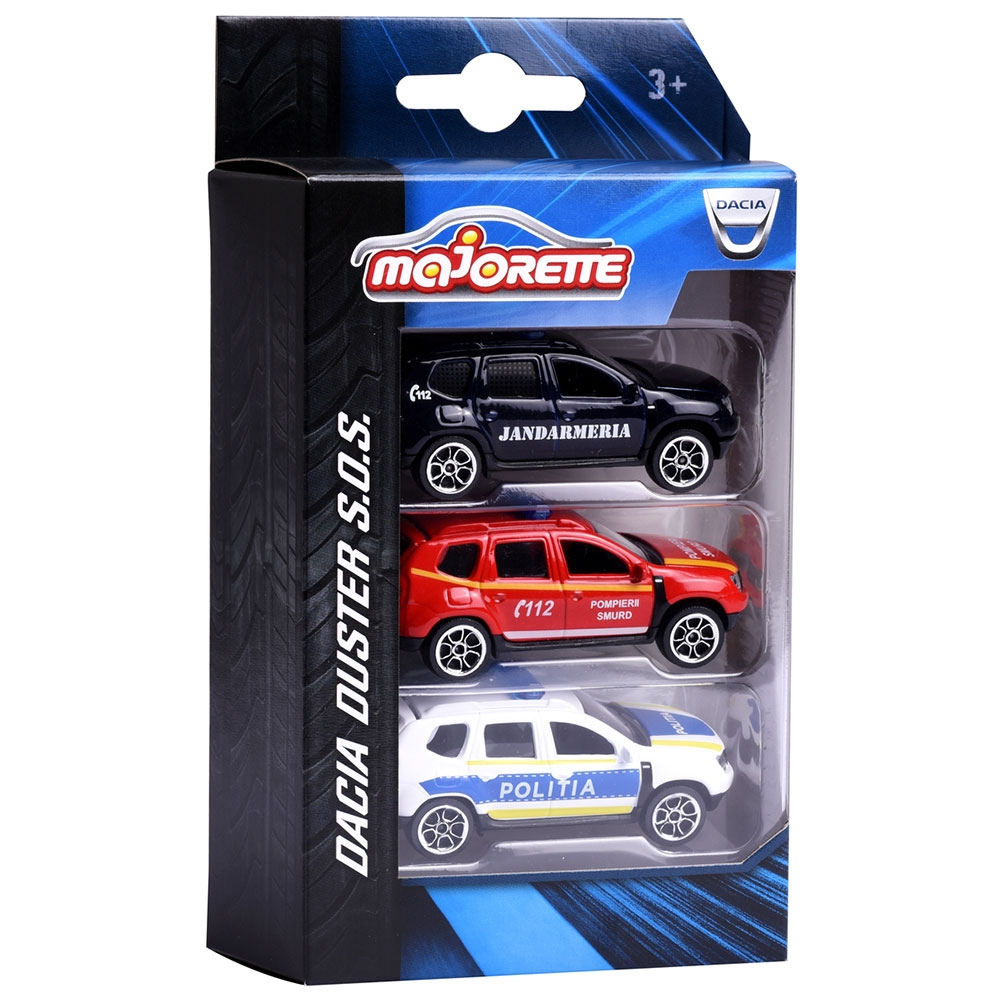 Detalii Set Majorette Dacia Duster SOS cu masina de jandarmerie, salvare si politie