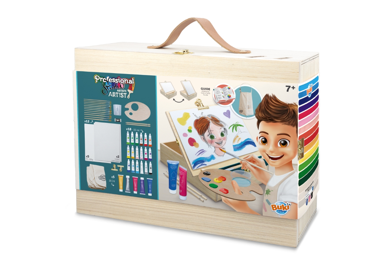 _x000D_Continut: 1 cutie, 1 șorț de artist, 2 pânze subțiri (format A4), 5 coli de hârtie A4 de 230 g, 2 cleme metalice pentru fixare, 12 pensule de diferite forme și dimensiuni, 1 radieră, 1 creion HB, 1 creion 2B, 1 paletă de lemn cu recipient, 18 tuburi a câte 22 ml de vopsea acrilică și 5 tuburi a câte 20 ml de vopsea cu sclipici și 1 ghid cu ilustrații color.