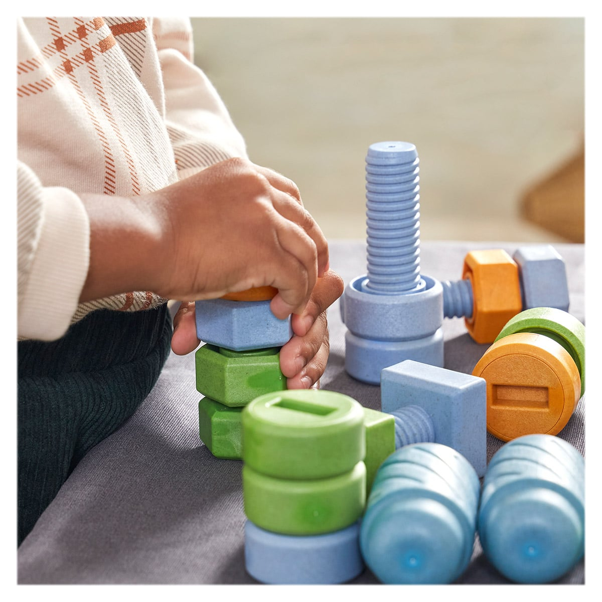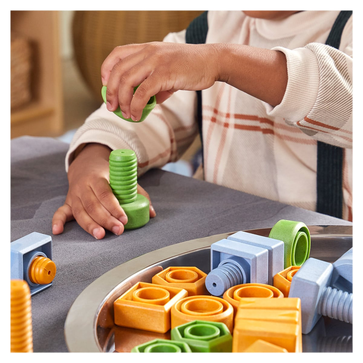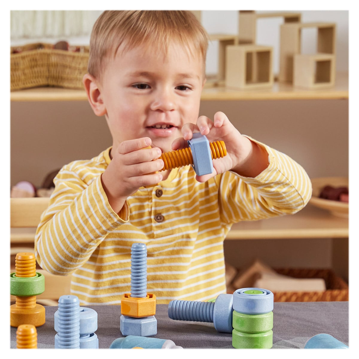 • Un set de 84 de suruburi si piulite din plastic de inalta calitate, in culori naturale frumoase, avand forme si marimi diferite si dimensiuni potrivite pentru mainile mici ale copiilor.