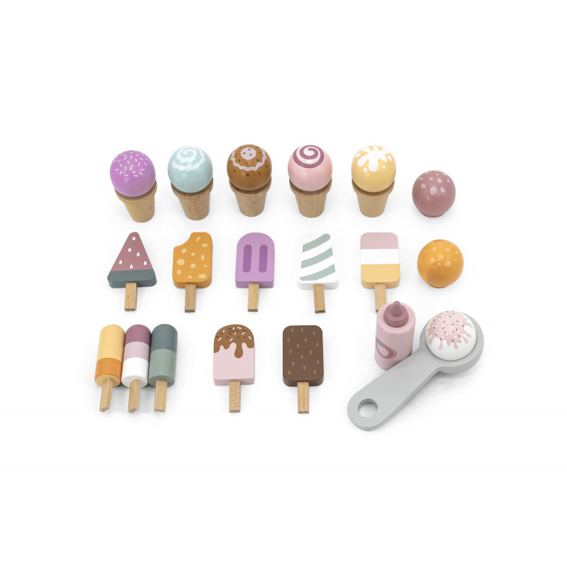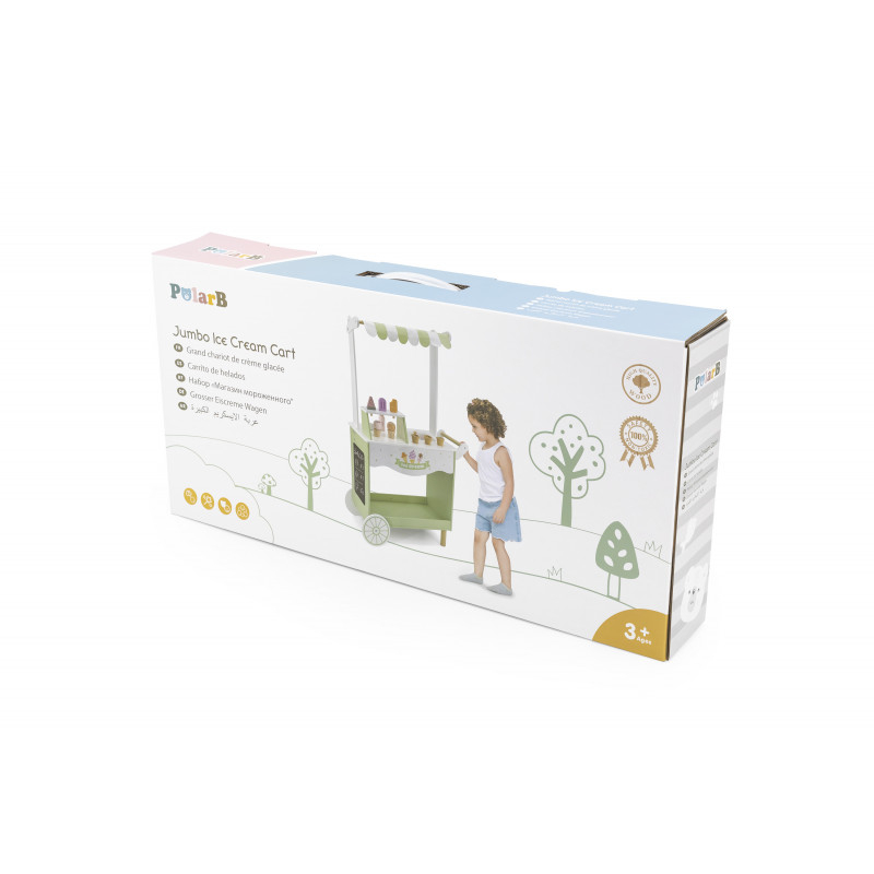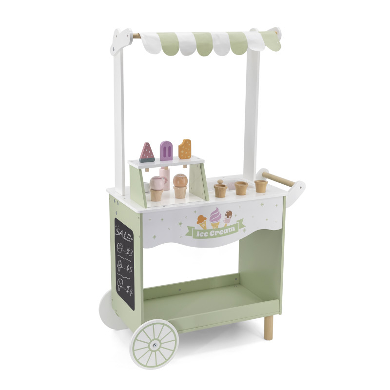 Aceasta toneta de inghetata pe roti, de dimensiune jumbo, este echipata cu bile si conuri de inghetata, popsicle si o lingurita magnetica pentru o experienta realista cu caruciorul cu inghetata!  Bilele de inghetata pot fi asortate dupa bunul plac. Foloseste cupa magnetica si alege-ti aroma preferata! Noteaza aroma speciala de astazi pe tabla din lateral. Spatiul de depozitare este disponibil in partea de jos a tonetei de inghetata. Rotile ajuta la mutarea cu usurinta a caruciorului.  Acest joc de rol incurajeaza imaginatia, creativitatea, precum si dezvoltarea abilitatilor sociale si a limbajului. Jucarie educativa din lemn, Montessori. Material: lemn  Dimensiuni: 104 x 63 x 30,5 cm  Varsta recomandata: 3 ani+  *AVERTISMENT! Contraindicata copiilor mai mici de 3 ani. Jucaria/produsul poate contine piese mici care se pot inghiti sau inhala existand pericolul de sufocare sau nu este potrivita copiilor mai mici de luni. Toate jucariile marca VIGA sunt fabricate din lemn de calitate cu vopsele si cerneluri non-toxice, supuse testelor de siguranta respectand standardele pentru jucarii ale Uniunii Europene EN71 si ASTM. Nu lasati ambalajul produsului la indemana copiilor. Indepartati orice ambalaj al produsului inainte de a da jucaria copilului. Va recomandam sa supravegheati copilul in timp ce se foloseste produsul. Pastrati instructiunile si etichetele pentru referinte viitoare. Feriti produsul de foc, temperaturi ridicate si umiditate.