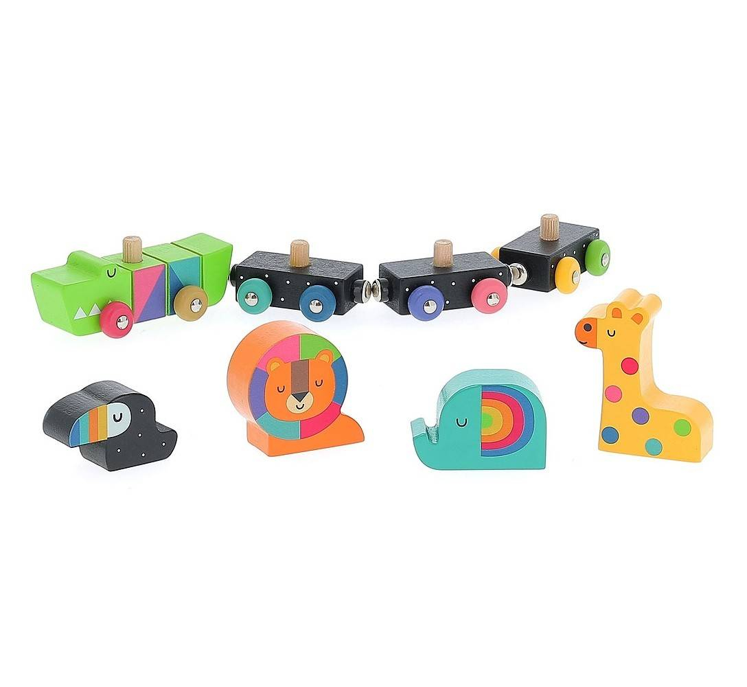 Varsta recomandata: 18 luni+Tren din lemn cu 3 vagoane magnetice È™i 4 pasageri in forma de animale.Acest trenuleÈ› frumos din lemn permite copiilor să se joace cu animalele detaÈ™abile È™i apoi să le pună înapoi pe cărucioarele magnetice pentru a le duce la plimbare.Contine: 1 x locomotiva crocodil, 3 x vagoane magnetice, 4 x animale detasabile(tucan, girafa, elefant, leu)Aceasta jucarie stimuleaza fina motricitate, invatarea culorilor si  a animalelor.Dimensiune : 36 x 5 x 10 cm
